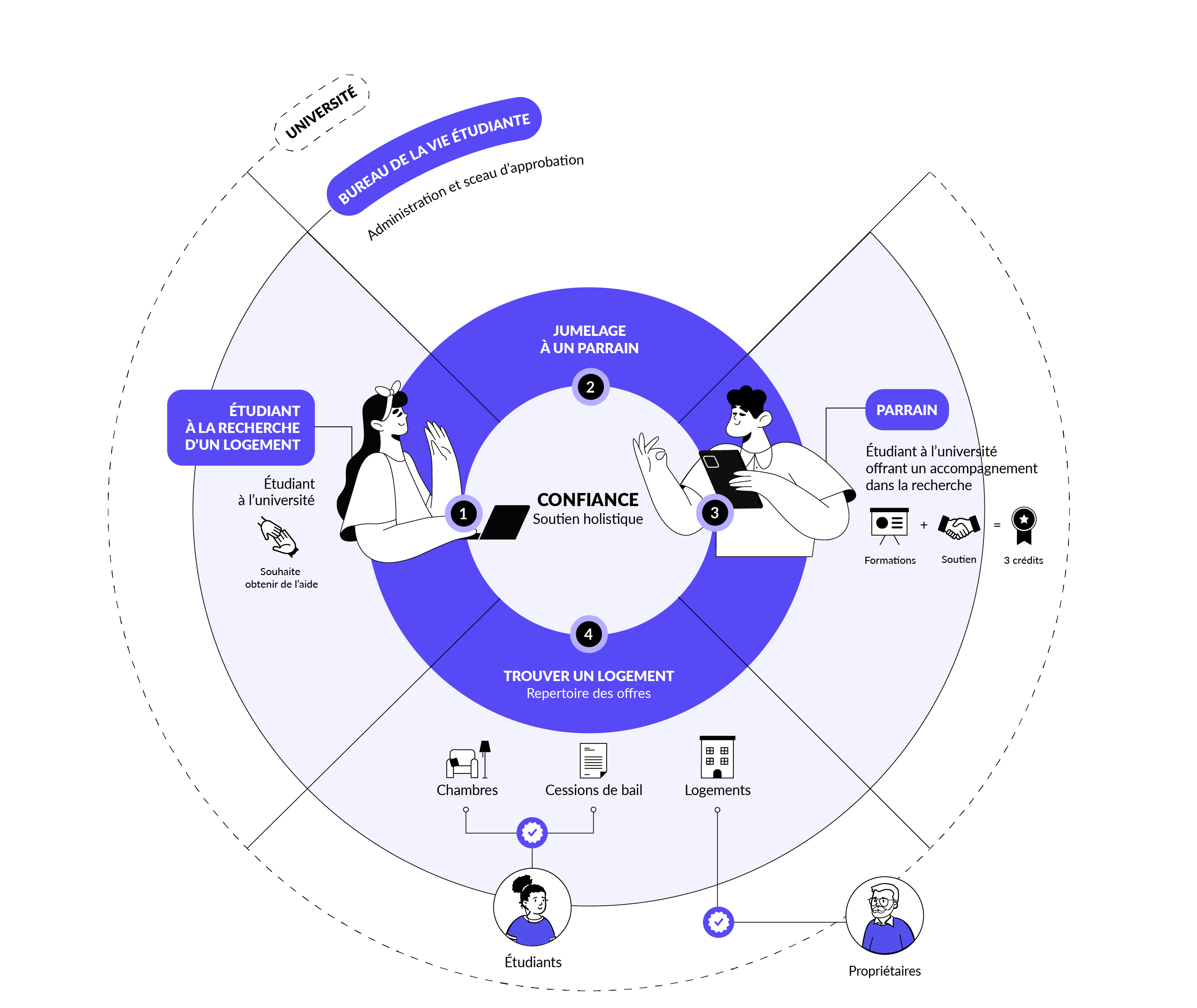 Une solution holistique axée sur l'utilisateur, visant à simplifier le processus de recherche de logement chez les étudiants, tout en renforçant le soutien communautaire et la confiance au sein de l'environnement académique des institutions universitaires québécoises.